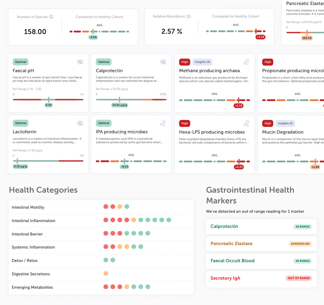 Our analysis detects over 28,000 microbial species and measures 21 key markers, giving you a detailed diversity score and clear, personalised insights to better understand and improve your overall gut health.